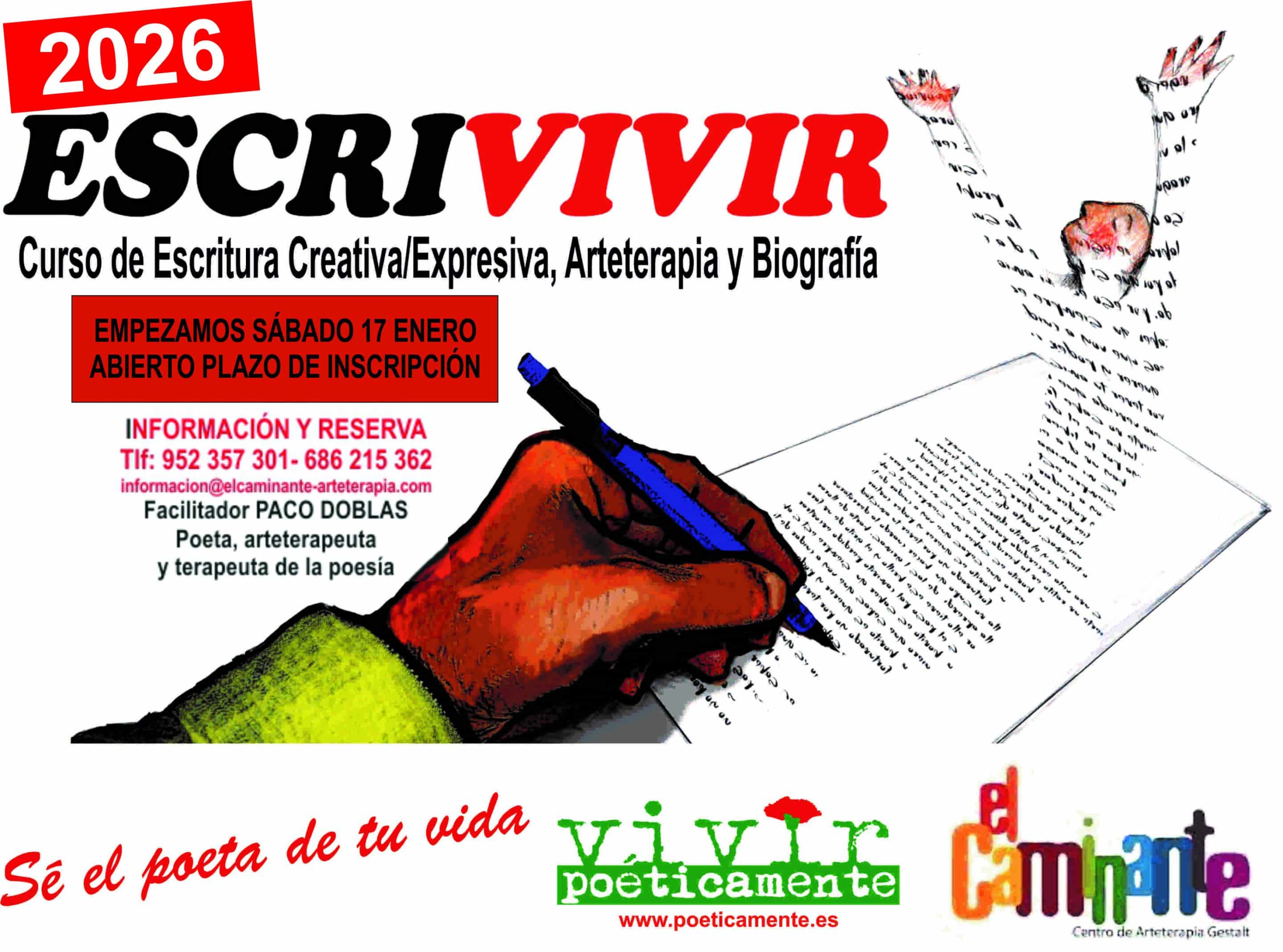 El próximo sábado 17 de enero empezamos el curso ESCRIVIVIR 2026, impartido por PACO DOBLAS poeta, arteterapeuta gestalt y creador de la metodología VIVIR POÉTICAMENTE la Escuela de Arteterapia de Andalucía EL CAMINANTE (Málaga)