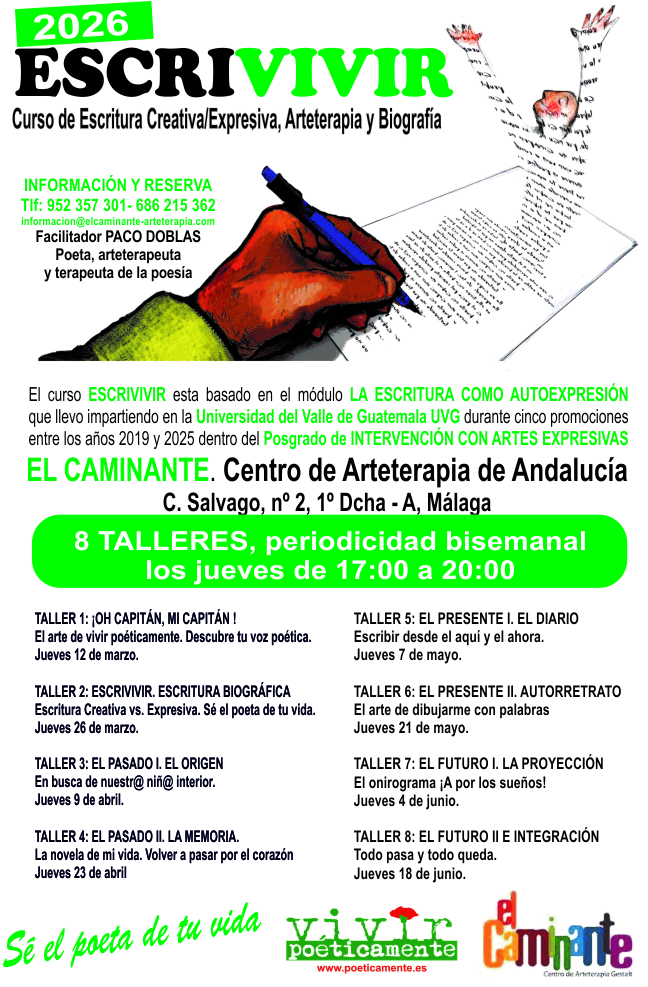 Hola, soy Paco Doblas, el facilitador de este curso, poeta, arteterapeuta y terapeuta de la poesía. Con esta carta te informo del curso ESCRIVIVIR. Sé el poeta de tu vida que impartiré en la Escuela de Arteterapia de Andalucía EL CAMINANTE en Málaga, una versión ampliada del módulo LA ESCRITURA COMO AUTOEXPRESIÓN, que llevo impartiendo dentro del posgrado universitario INTERVENCIÓN CON ARTES EXPRESIVAS en la UVG (Universidad del Valle de Guatemala) durante 6 promociones entre los años 2019 y 2025. Si quieres saber más sobre mi te invito a que visites mi página web www.poeticamente.es