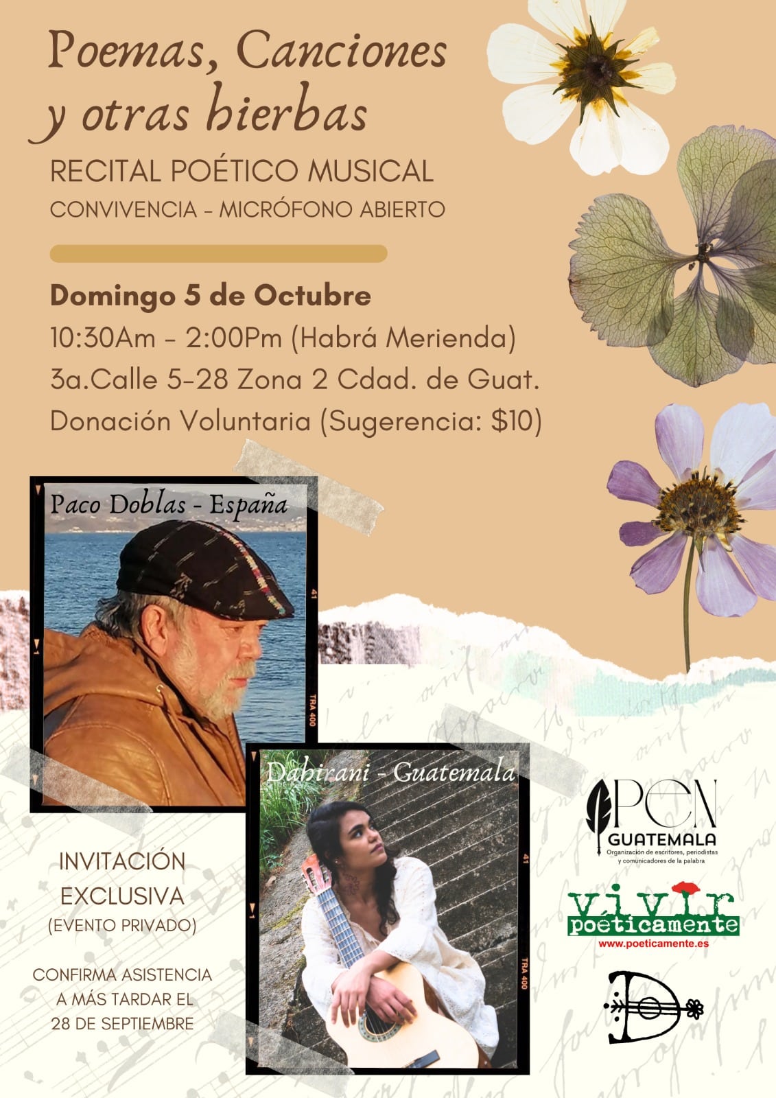 Se me va agotando mi tiempo de estancia por Guatemala y para este domingo 5 de octubre hemos preparado con la Asociación PEN GUATEMALA de escritores y periodista una despedida muy especial, un broche de oro, con un recital conjunto con mi querida amiga la cantautora guatemalteca Dahirani, un experimento poético musical donde mezclaremos mis versos con sus canciones. Sera un evento muy íntimo al que asistiran sólo una venitena de personas en vivo, pero que será transmitido ONLINE para quien quiera seguirlo desde Guatemala, desde España o desde cualquier lugar del mundo.